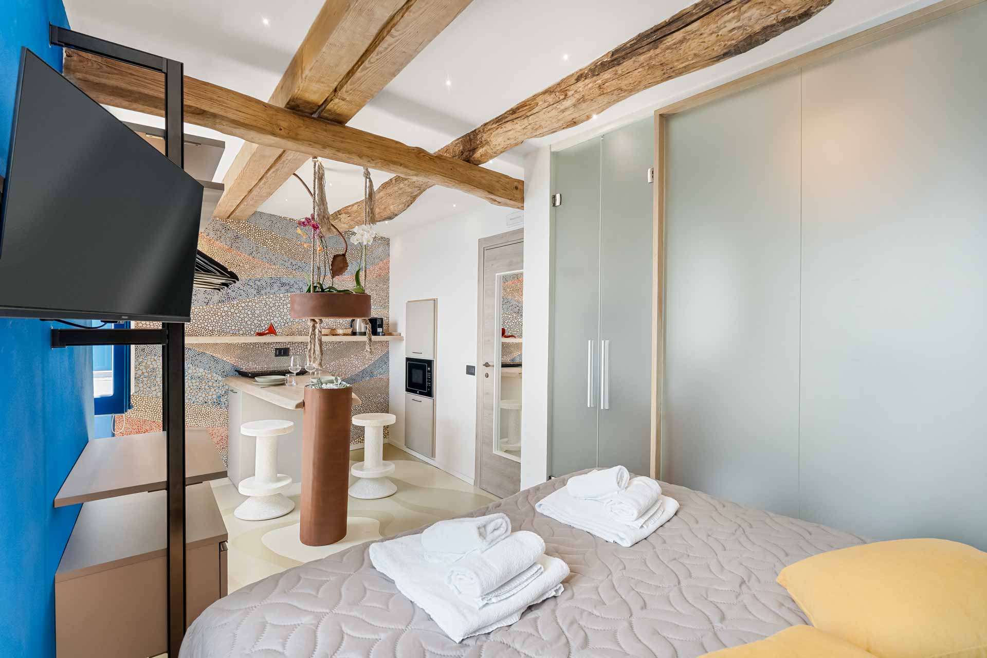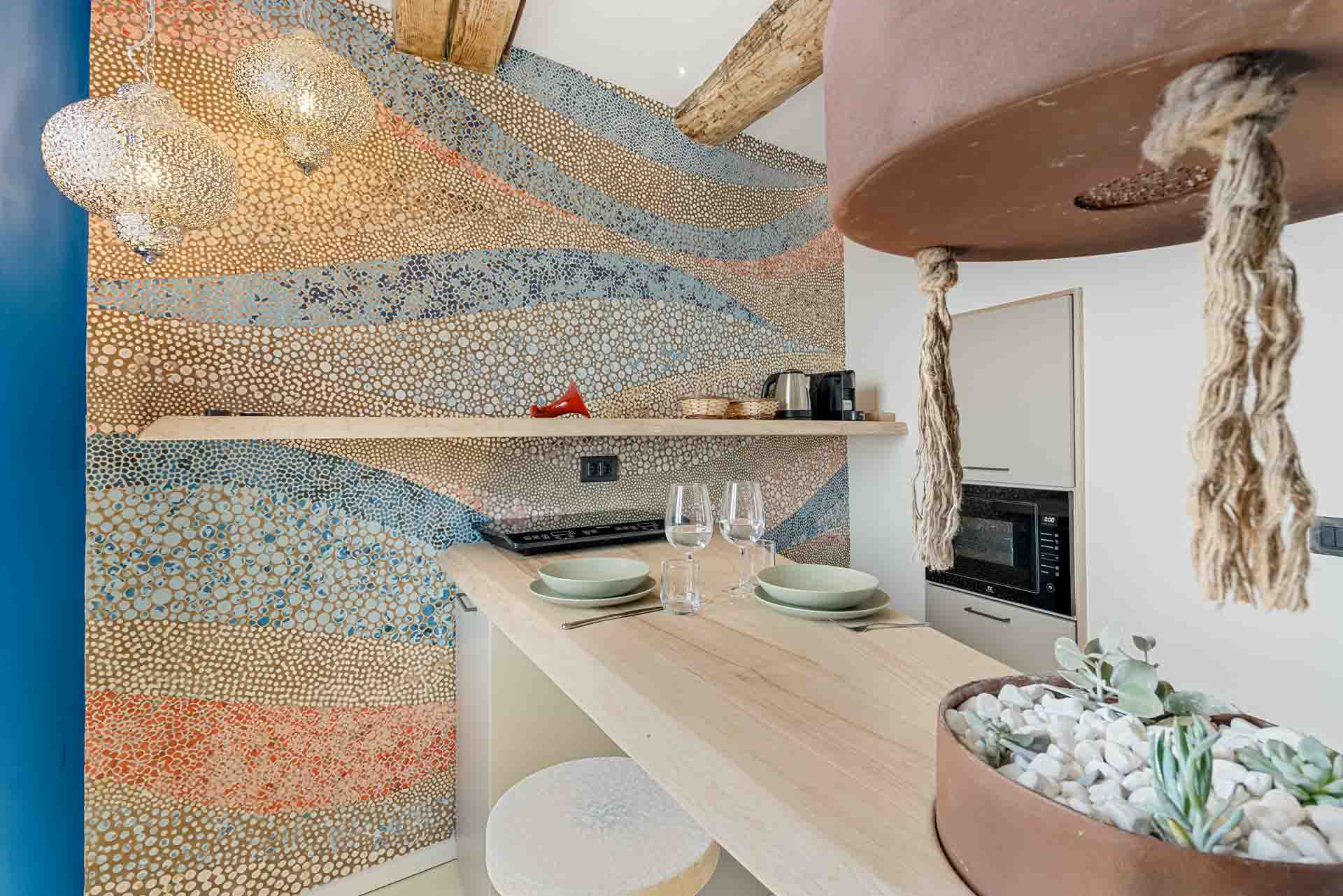 Dotata di aria condizionata, letto matrimoniale, bagno con box doccia, penisola per rilassarsi con un caffè guardando l’incredibile vista mare dalle due finestre della camera.