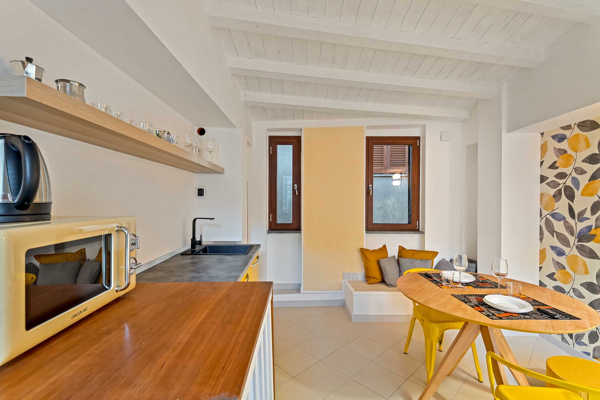 Le pareti sono impreziosite da una splendida carta da parati decorata con limoni, che dona un tocco di freschezza.